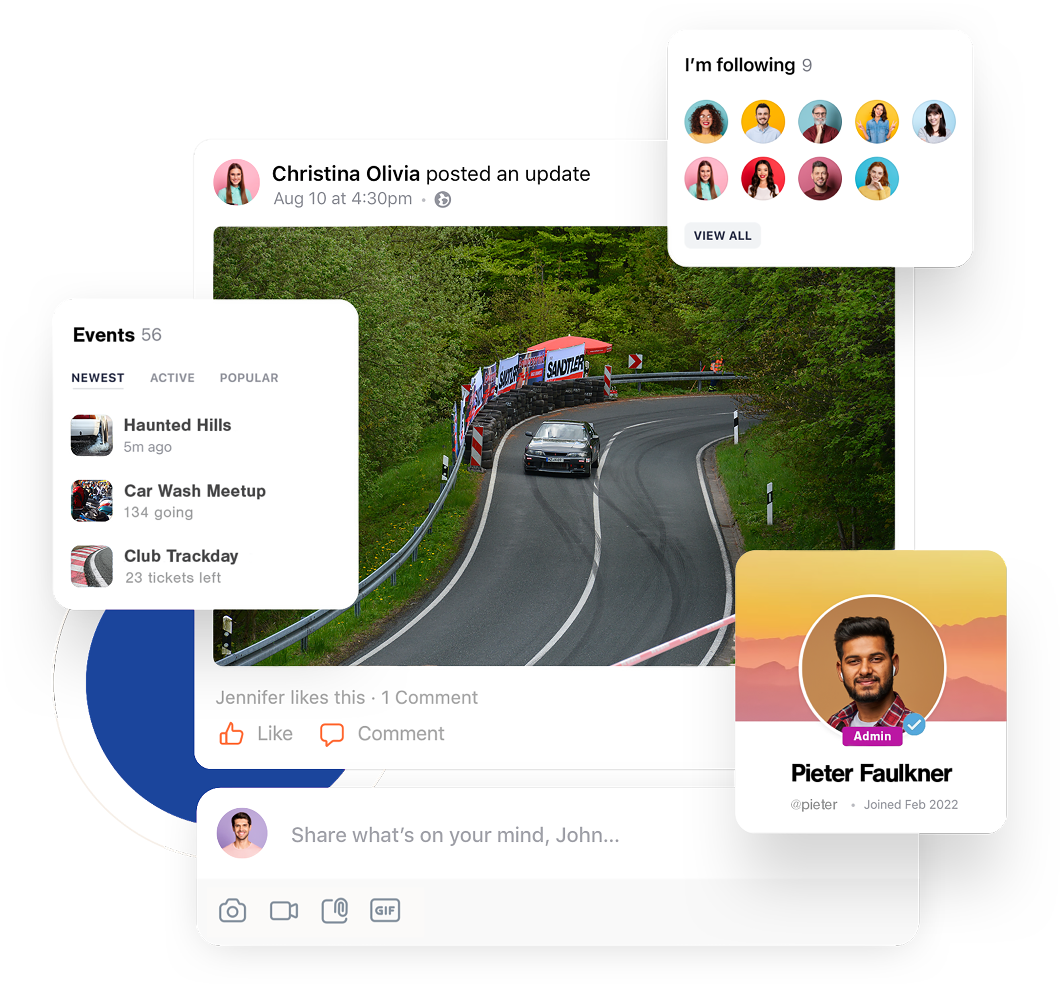 Publish open, private, or hidden events. Allow admins or members to create and manage events. Send invites, track RSVPs, sell tickets and host virtual events inside your club.